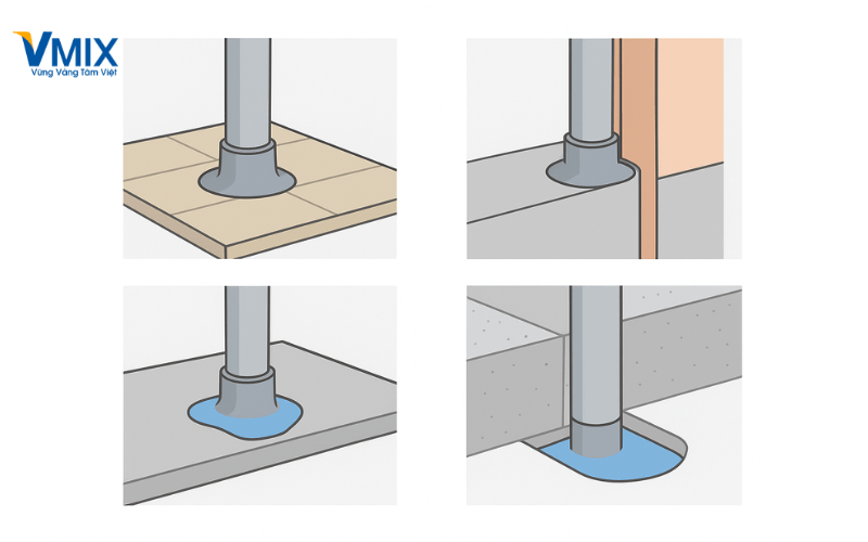 Cổ ống là vị trí xuyên sàn, xuyên tường để dẫn nước, điện, điều hòa hoặc ống kỹ thuật khác. Đây là khu vực dễ bị thấm nhất trong công trình, đặc biệt là tại: